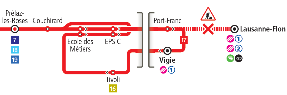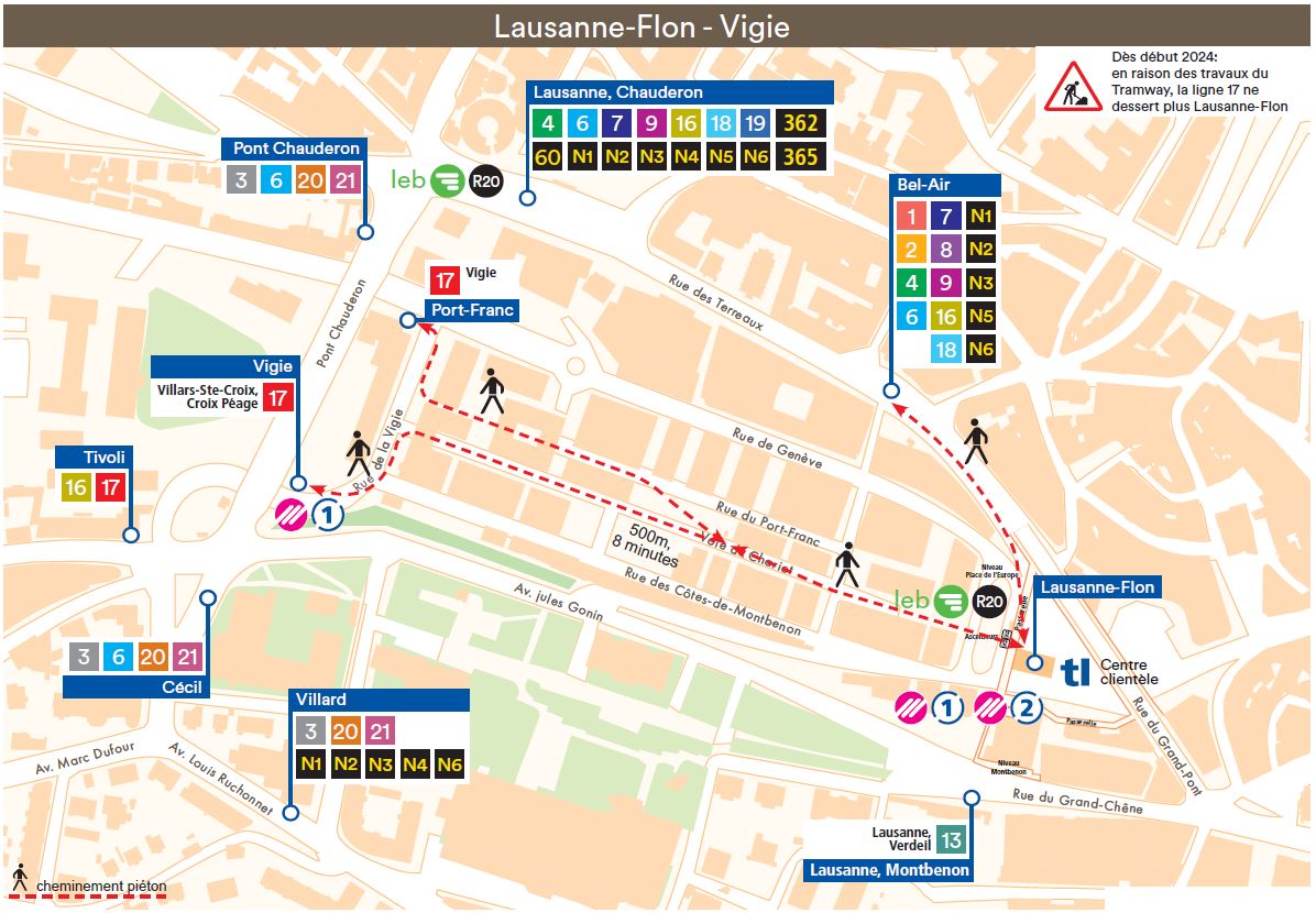 Le terminus de la ligne 17 est déplacé à Vigie. L’arrêt Port-Franc est avancé de 200 mètres sur la rue de Genève et desservi uniquement direction Vigie. Depuis le nouveau terminus, la ligne dessert l’arrêt Tivoli et continue vers les écoles professionnelles et supérieures (ETML et EPSIC) avant de retrouver son itinéraire actuel direction Villars-Ste-Croix. Cette boucle vous permet de rejoindre la ligne 17 depuis la gare de Lausanne via l’une des lignes 3, 20, 21, jusqu’à l’arrêt Cécil.